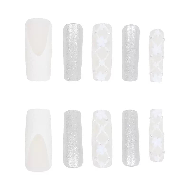 Wedding & Party Essential, Long Press-On Nails with Pearls, Flowers, and Glitter for a Bridal Atmosphere